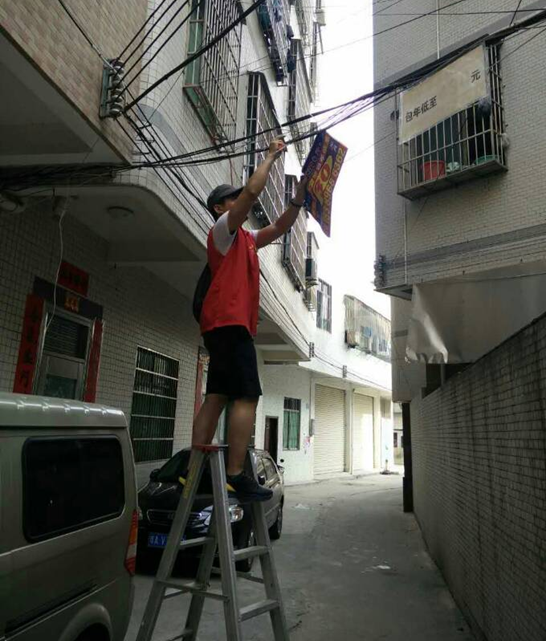 志愿者不顧危險(xiǎn)清除電線桿上的小廣告