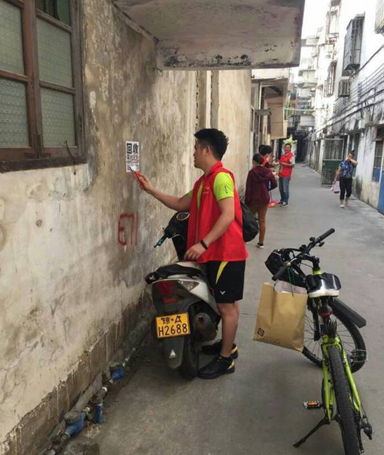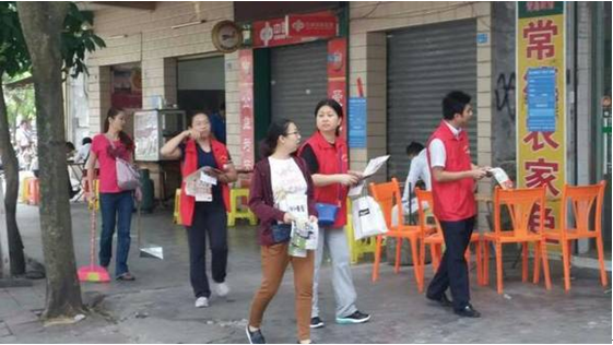 志愿者們?yōu)檫^往居民發(fā)放雙創(chuàng)知識(shí)宣傳資料