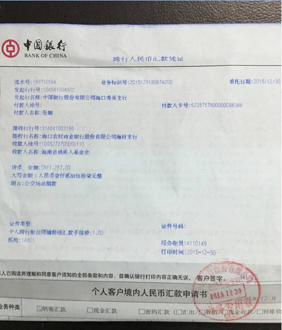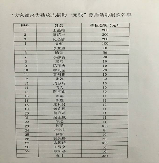 我司認真貫徹落實國資委《關(guān)于開展“大家都來為殘疾人捐助一元錢”愛心萬里行走進海口助殘募捐活動實施方案》的文件精神,認真組織場站公司職工積極參與“大家都來為殘疾人捐助一元錢”募捐活動,大家紛紛慷慨解囊,踴躍捐款,奉獻愛心,現(xiàn)場共籌集善款1257元。