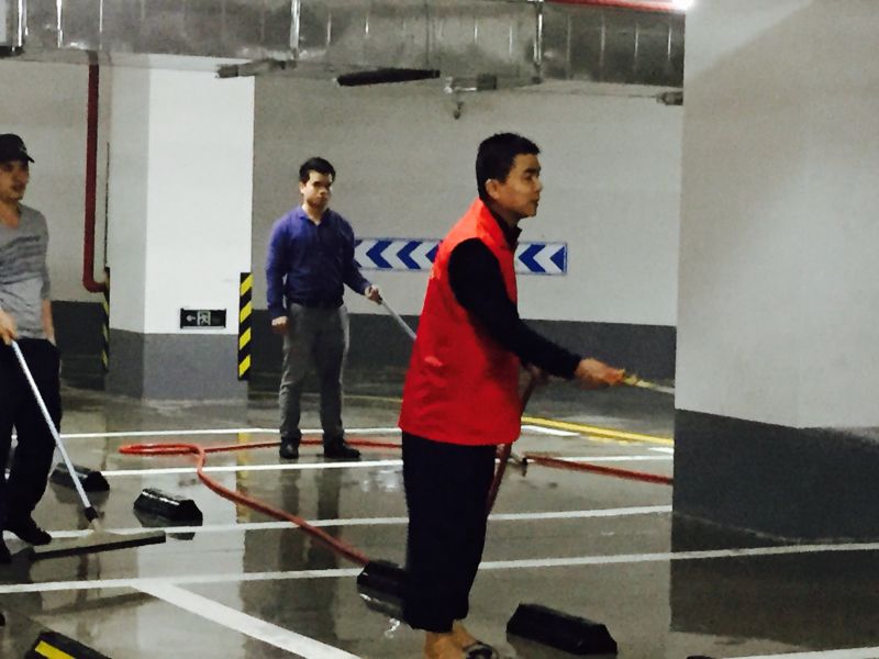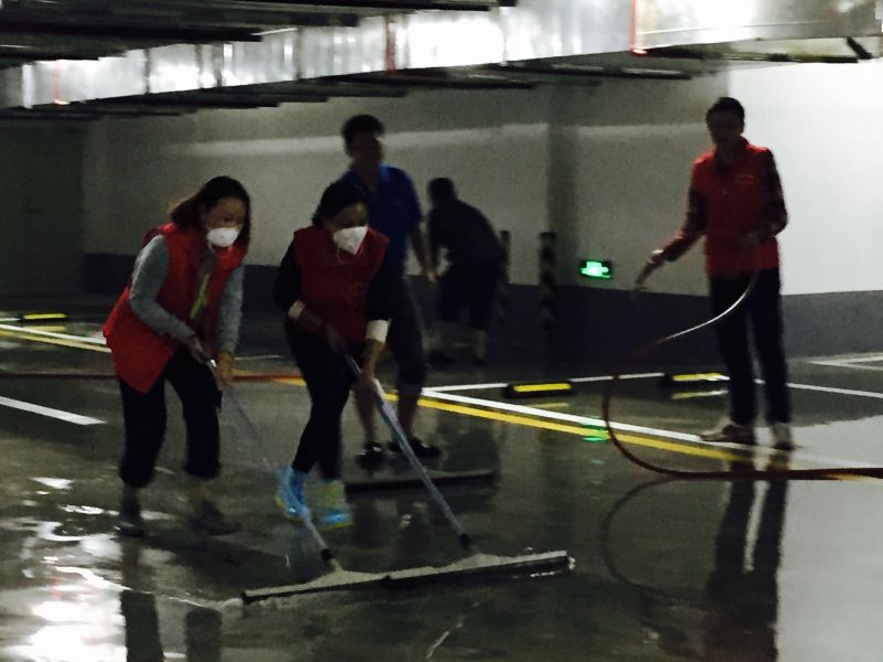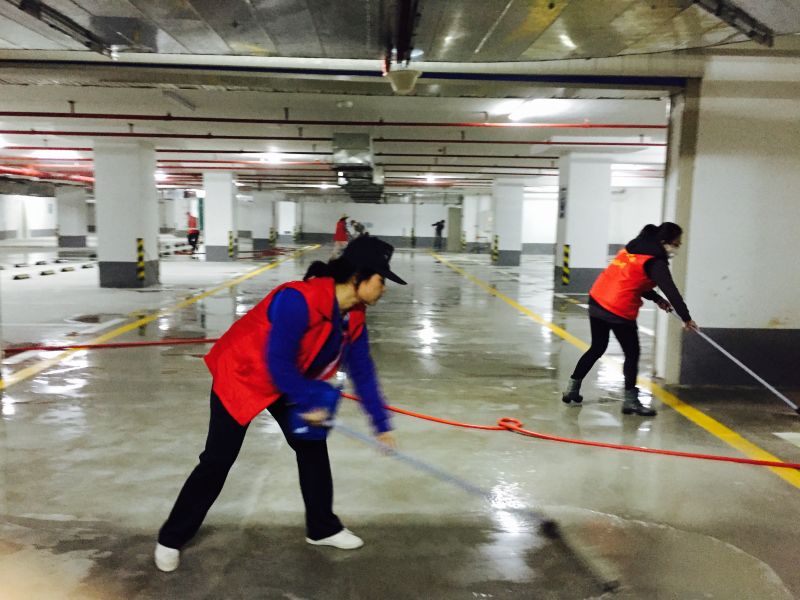 大家不顧灰塵飛揚(yáng)、不顧悶熱,沖洗、刷地、掃水,大家合理分工,都忙得不可開(kāi)交。經(jīng)過(guò)2個(gè)多小時(shí)的辛勤勞動(dòng),終于讓停車(chē)場(chǎng)的地面煥然一新。