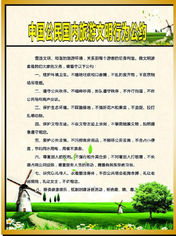 6、尊重別人權(quán)利。不強行和外賓合影,不對著別人打噴嚏,不長期占用公共設(shè)施,尊重服務(wù)人員的勞動,尊重各民族宗教習俗。