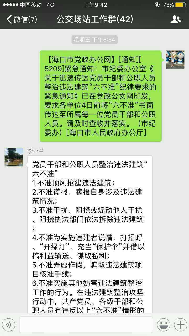 3月3日下午,公交場站公司第一時間在公司內(nèi)部工作微信群向全體員工迅速傳達(dá)《中共??谑屑o(jì)委辦公室關(guān)于迅速傳達(dá)黨員干部和公職人員整治違法建筑“六不準(zhǔn)”紀(jì)律要求的緊急通知》。