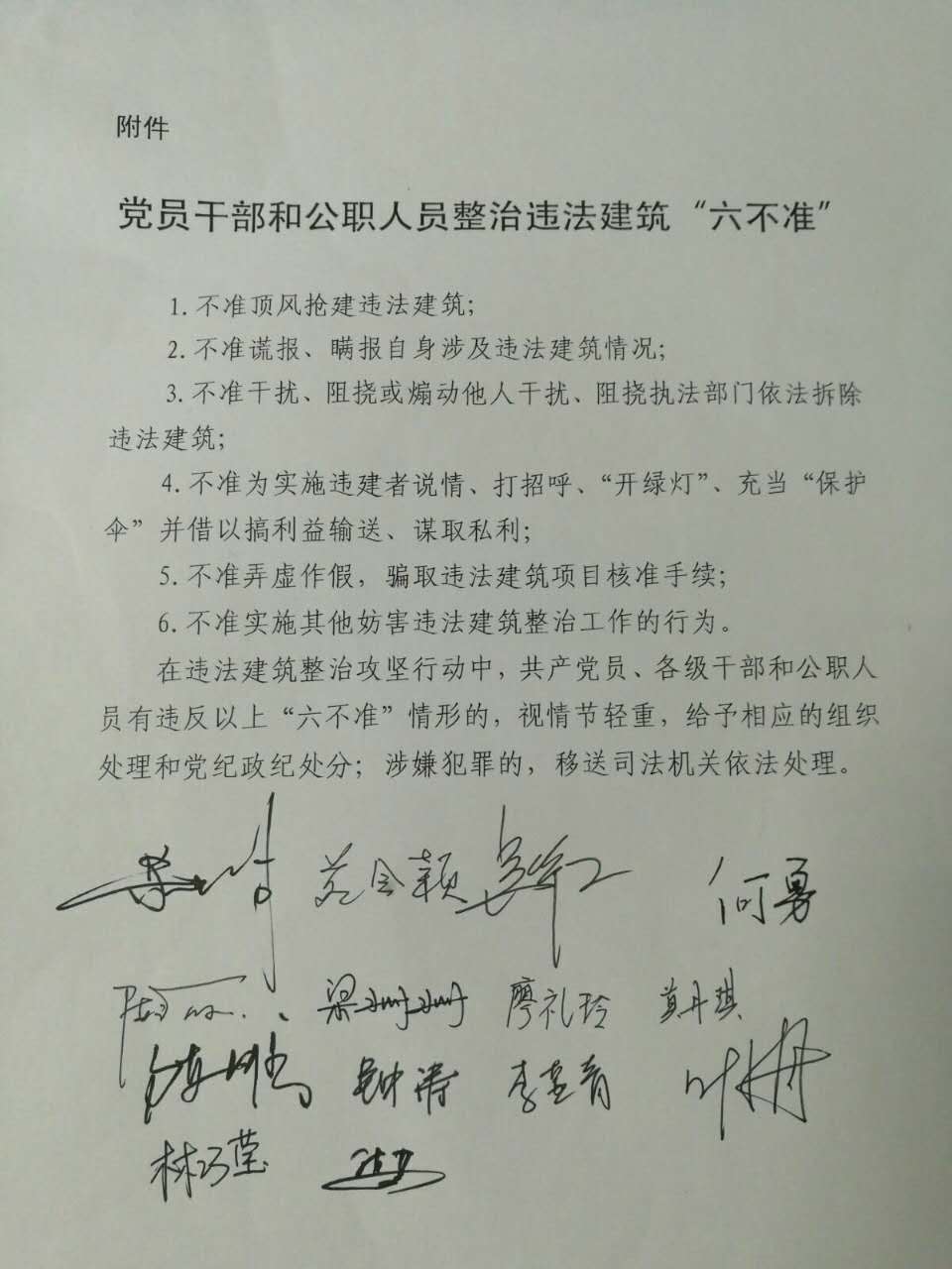 黨員干部在整治違建“六不準(zhǔn)”上面簽字承諾