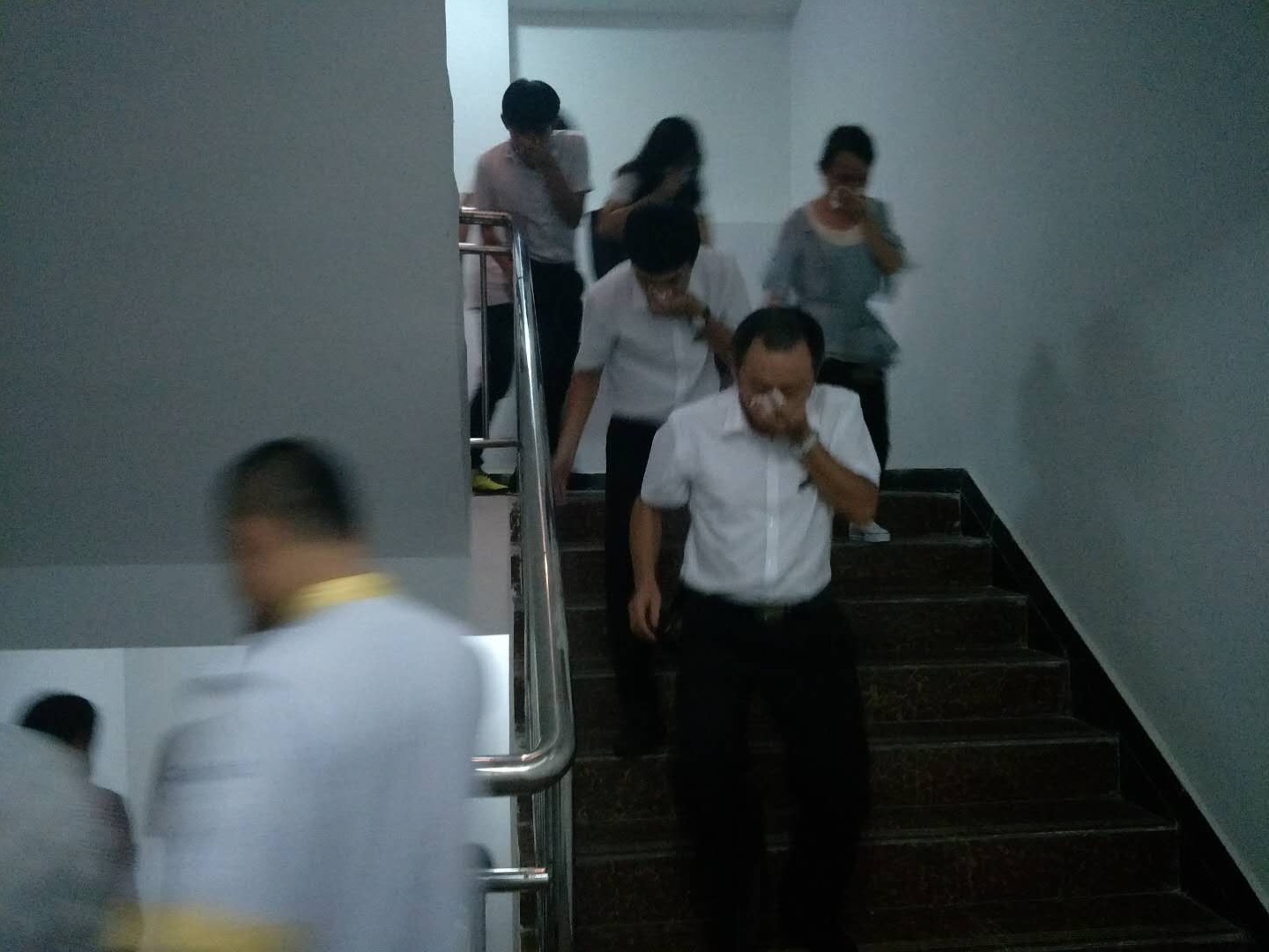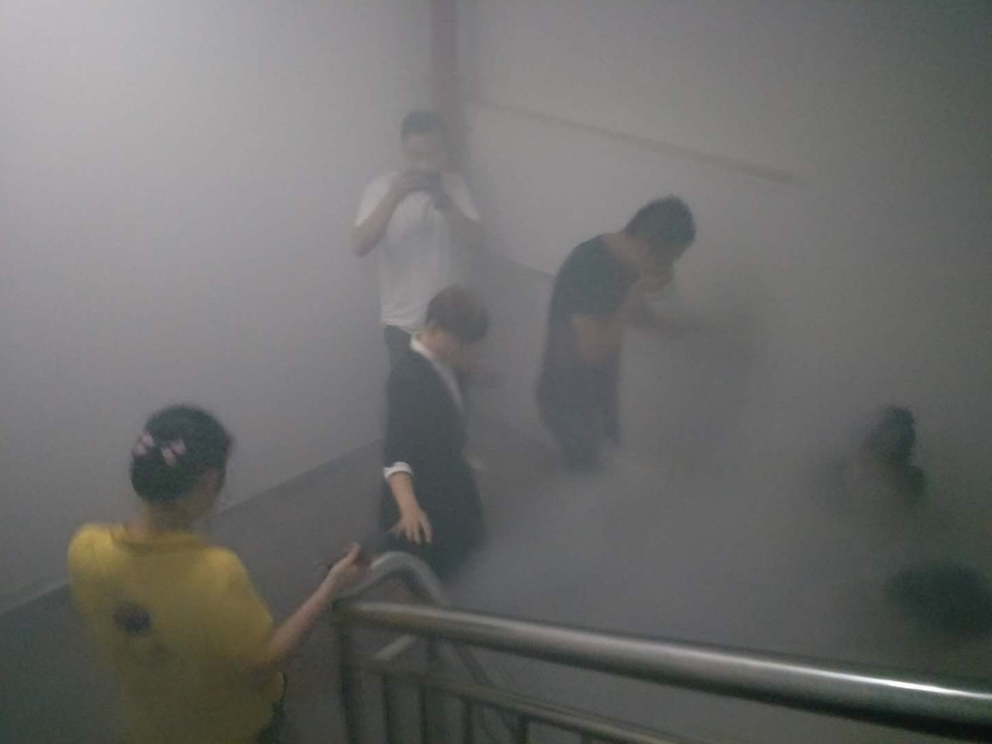 由金盤中隊消防官兵組織和指揮參加演練的人員自樞紐站5樓到1樓戶外的消防緊急疏散演練,參演人員用水打濕毛巾穿過濃煙密布的消防通道;