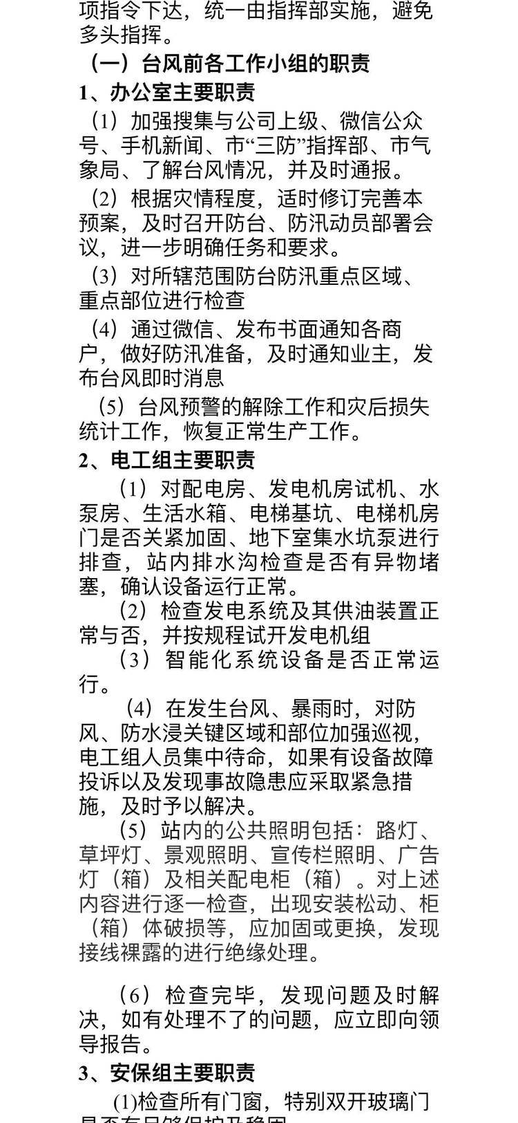 二、起稿“東站公交樞紐站防臺(tái)風(fēng)應(yīng)急防范措施”,成立東站公交樞紐站防臺(tái)風(fēng)工作領(lǐng)導(dǎo)小組。領(lǐng)導(dǎo)小組下設(shè)五個(gè)工作小組,即辦公室、電工組、安保組、保潔組。各小組按職責(zé)展開分工;
