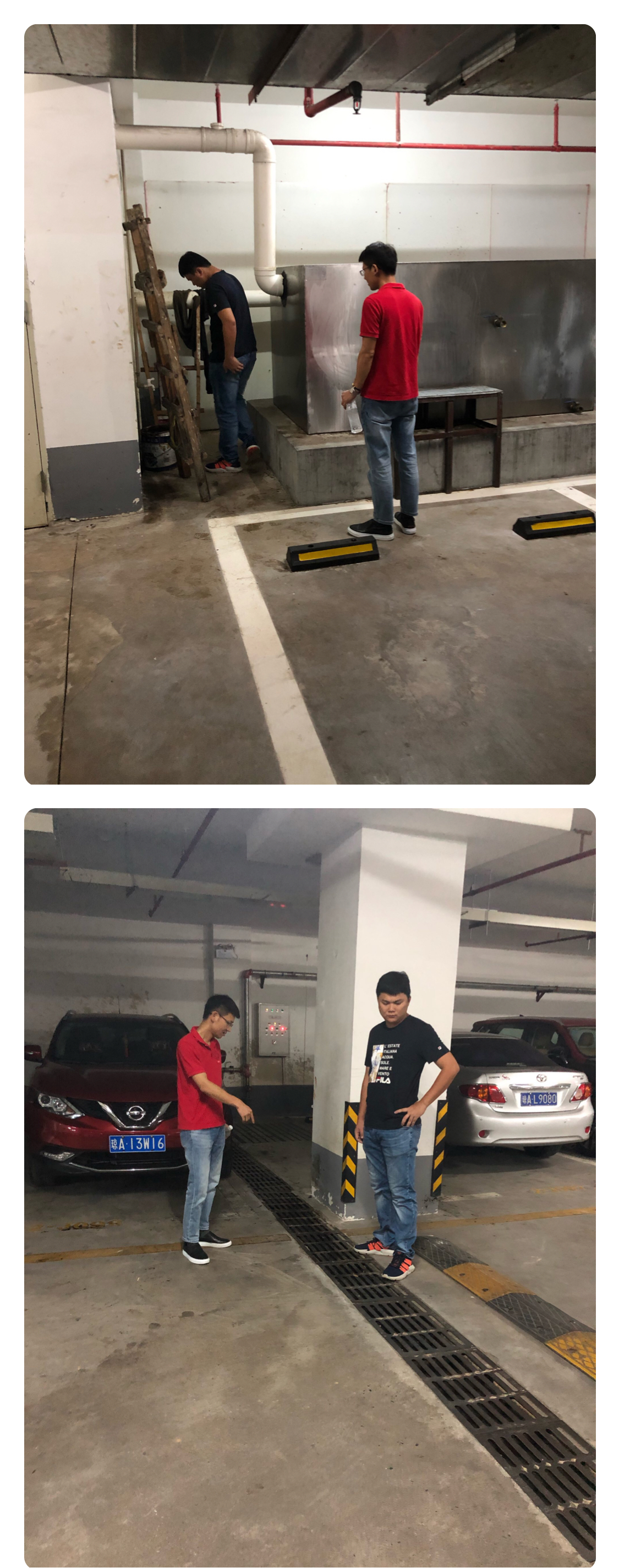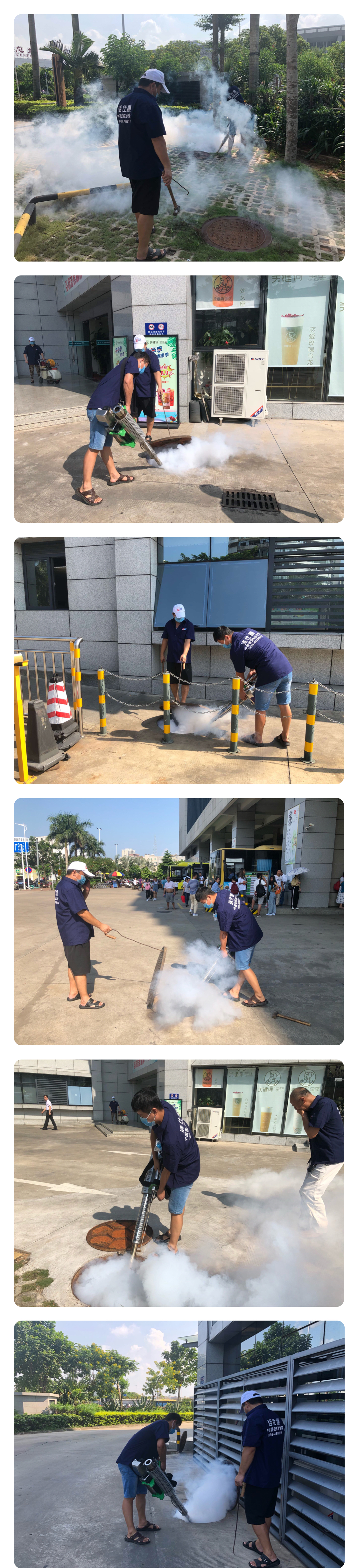 工作人員對(duì)地下室停車場(chǎng)集水井、排水溝、設(shè)備房等蚊蟲孽生地進(jìn)行消殺工作